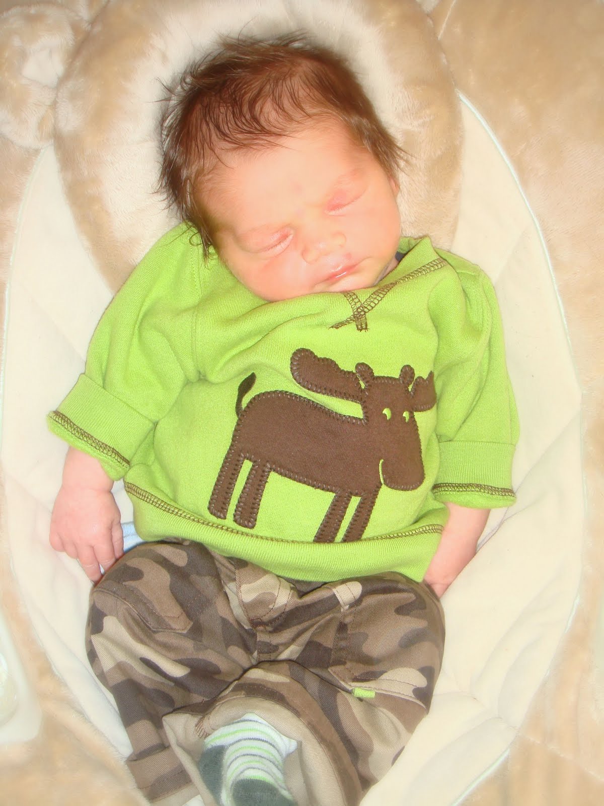 He has tons of dark hair just like Harrison did at birth, but is much rounder in the body and face. His eyes are dark grey/blue. I have a feeling this boys going to be dark with dark eyes like me.