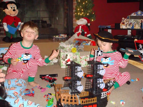 Santa was all about pirates this year! Pirate ships to play with and ride in, one for the bath, and pirate figures, Peter Pan figures and swords!